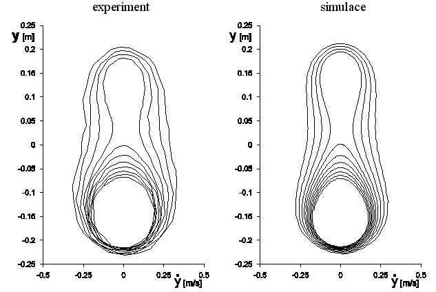 Obr. 4: Srovnání projekcí fázových portrétů volného kmitání konstrukce získaných z experi-mentu (vlevo) a z numerické simulace (vpravo)