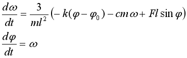 Pro nalezení bifurkačního bodu můžeme užít postupu popsaného v úvodu tohoto příspěvku. Aplikací vztahu (1) na pohybové rovnice (27) dostáváme: