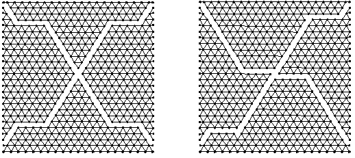 Modelován byl homogenní čtvercový vzorek rozdělený na 559 hmotných bodů situovaných do pravidelné, dokonale symetrické „trojúhelníkové“ sítě pružin. Při spodním okraji byl uchycen neposuvně v obou směrech; při horním okraji byl uchycen neposuvně v horizontálním směru, přičemž svislý posuv se měnil konstantní rychlostí. Úloha byla řešena s ohledem na kvalitativní hodnocení průběhu lomu. V závislosti na hodnotách parametrů interakční funkce vznikaly různé obrazce porušení, viz obr. 3 a 4.