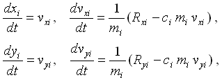 kde xi a yi jsou souřadnice i-tého hmotného bodu, vxi, vyi jsou složky aktuální rychlosti, Rxi, Ryi jsou složky aktuální výslednice interakčních sil Ri =